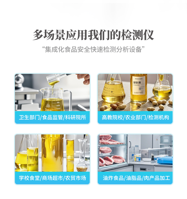 廣泛應用于質量監(jiān)督檢驗、工商管理、油炸食品生產基地、食藥監(jiān)局、衛(wèi)生部門、肉制品食品深加工企業(yè)、商場超市、各大食品安全監(jiān)測系統(tǒng)等單位使用。
