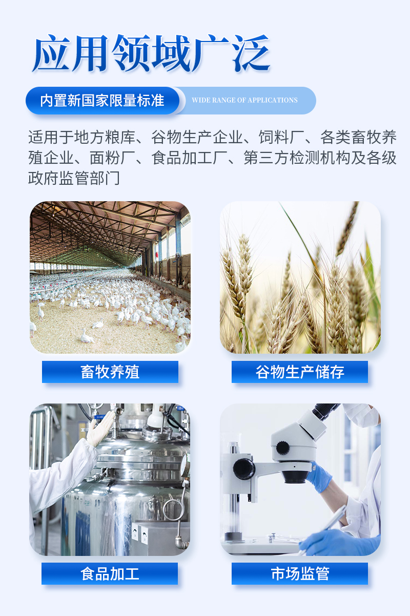 熒光定量真菌毒素快速檢測儀采用熒光定量快速檢測原理,主要檢測糧油谷物飼料中真菌毒素含量,包括黃曲霉毒素B1、黃曲霉毒素M1、玉米赤霉烯酮、嘔吐毒素、伏馬毒素等等,檢測樣品涵蓋糧食谷物(大米、玉米、小麥、大麥、高粱等)及其制品、飼料及其原料、食用油脂、牛奶及其制品等;樣品前處理簡單,整個檢測過程檢測12min,產品適用于地方糧庫、谷物生產企業(yè)、飼料廠、各類畜牧養(yǎng)殖企業(yè)、面粉廠、食品加工廠、第三方檢測機構及各級政府監(jiān)管部門;