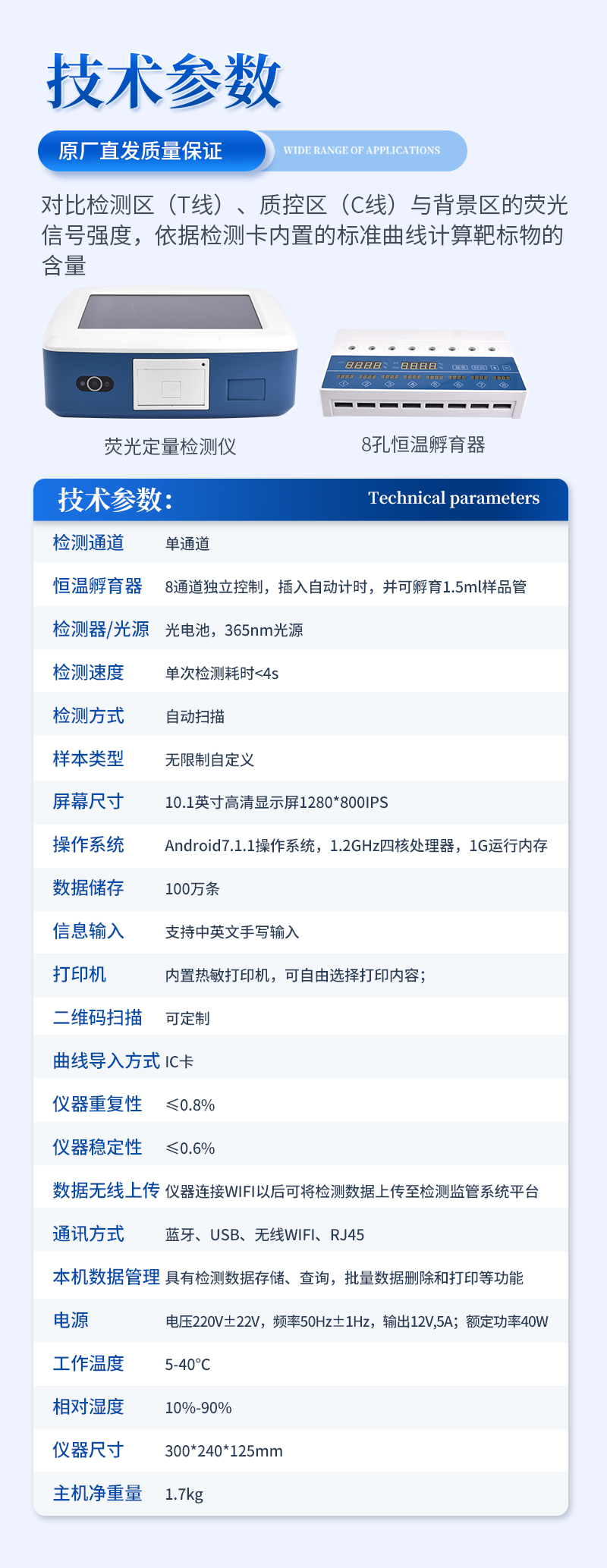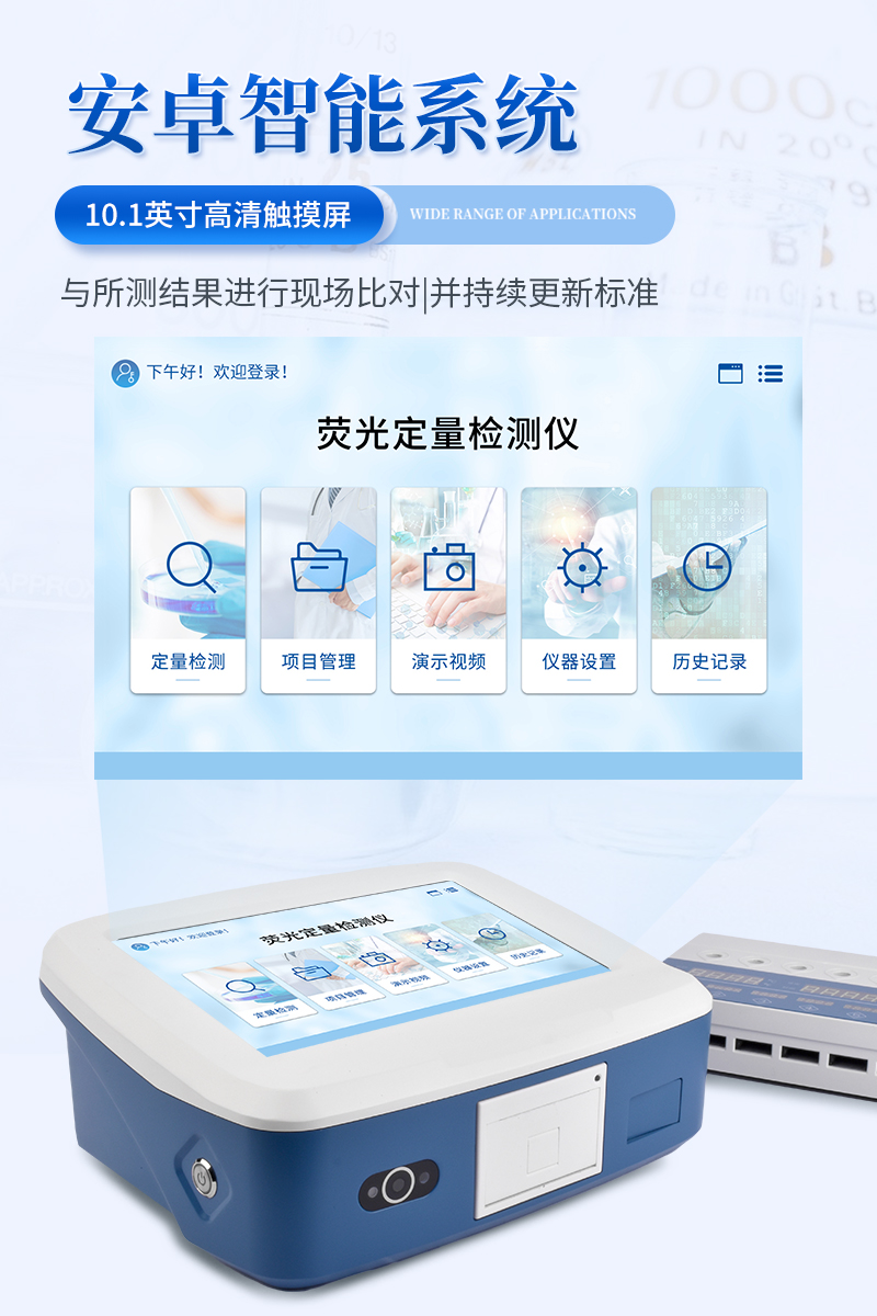 1、檢測原理:熒光定量免疫層析法,對比檢測區(qū)(T線)、質控區(qū)(C線)與背景區(qū)的熒光信號強度,依據檢測卡內置的標準曲線計算靶標物的含量;